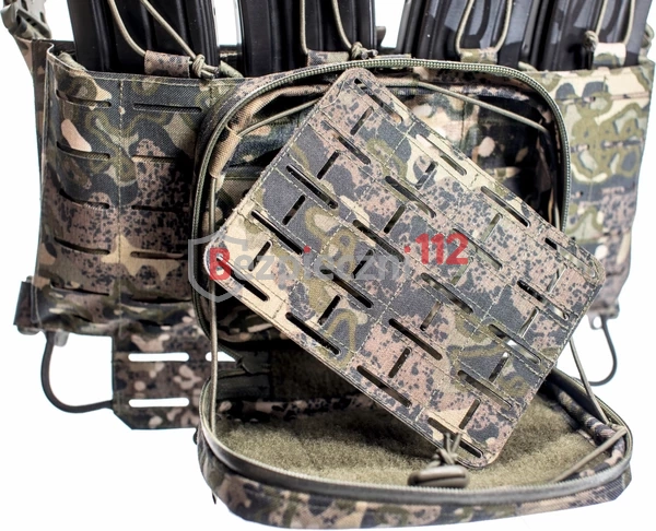 Chest Rig wykonany z laminatu z laserowo wycinanym systemem MOLLE który pozwala na montaż oporządzenia według potrzeb użytkownika. Dodatkowo wyposażony jest w kieszeń cargo oraz kieszeń przystosowaną do montażu wkładek na magazynki (w zestawie poczwórna ładownica karabinowa).