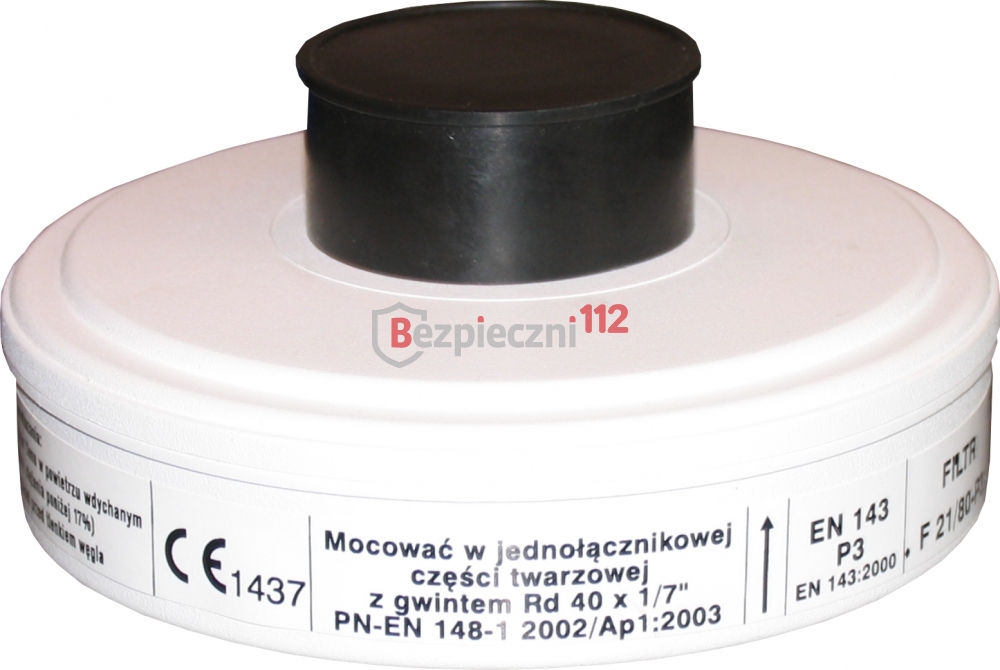 Filtr F 21/80-P3 po skompletowaniu z częścią twarzową wyposażoną w łącznik z gwintem Rd 40x1/7’’ służy do ochrony układu oddechowego przed pyłami, mgłami i aerozolami. Ochrona obejmuje cząstki stałe w postaci pyłów i zawiesin o wysokim stopniu rozdrobnienia, mgły i aerozole cieczy o mikronowych wymiarach cząstek, wszędzie tam gdzie zawartość tlenu w powietrzu wynosi minimum 17% obj. Filtr chroni także przed pyłami, mgłami i aerozolami po obłożeniu 120 mg chlorku sodu oraz 120 mg oleju parafinowego.