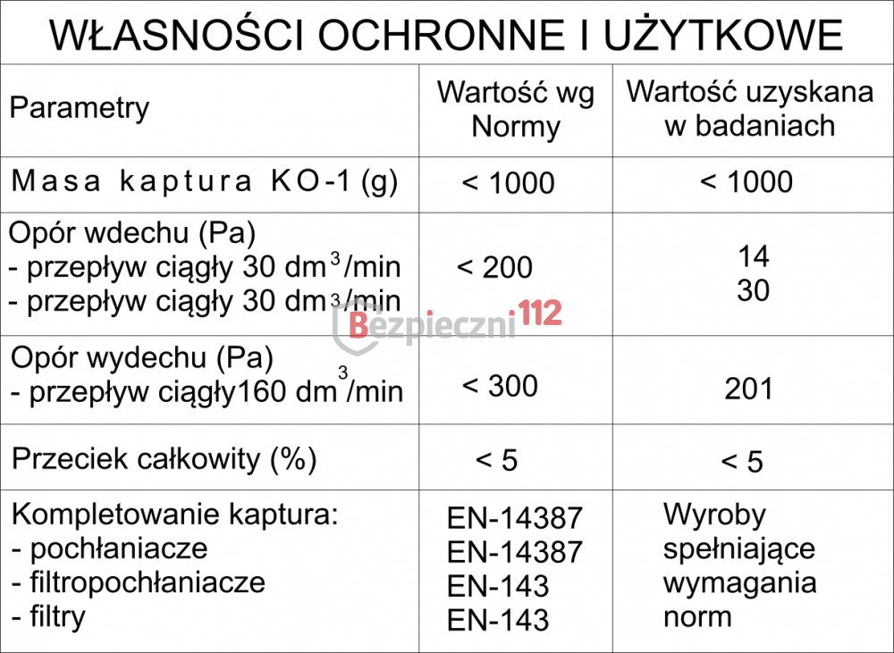 Kaptur ochronny KO-1 stanowi ochronę głowy, twarzy i dróg oddechowych. Po skompletowaniu z pochłaniaczami, filtropochłaniaczami i filtrami wyposażonymi w łącznik Rd 40x1/7” ( EN 148-1) stanowi ochronę przed parami i gazami oraz pyłami i aerozolami. Ochrona obejmuje związki organiczne o temperaturze wrzenia > 65oC, nieorganiczne za wyjątkiem tlenku węgla, gazy i pary kwaśne oraz amoniak i jego pochodne o ile ich sumaryczne stężenie objętościowe nie przekracza 0,5%, a także pyły, mgły i aerozole gdy stężenie tlenu w powietrzu wynosi minimum 17% obj.